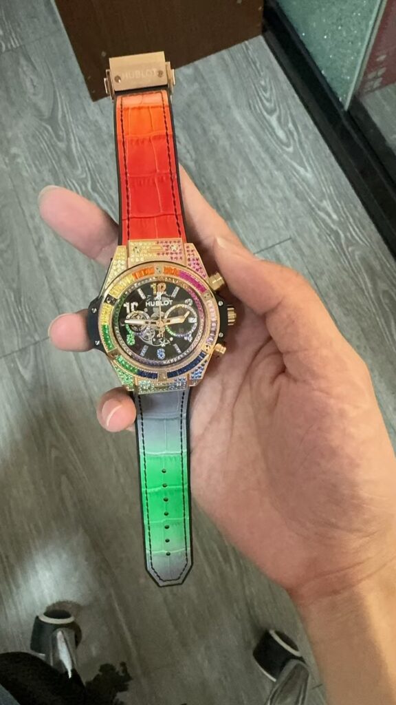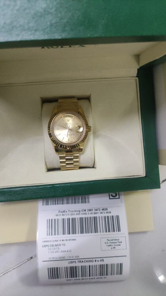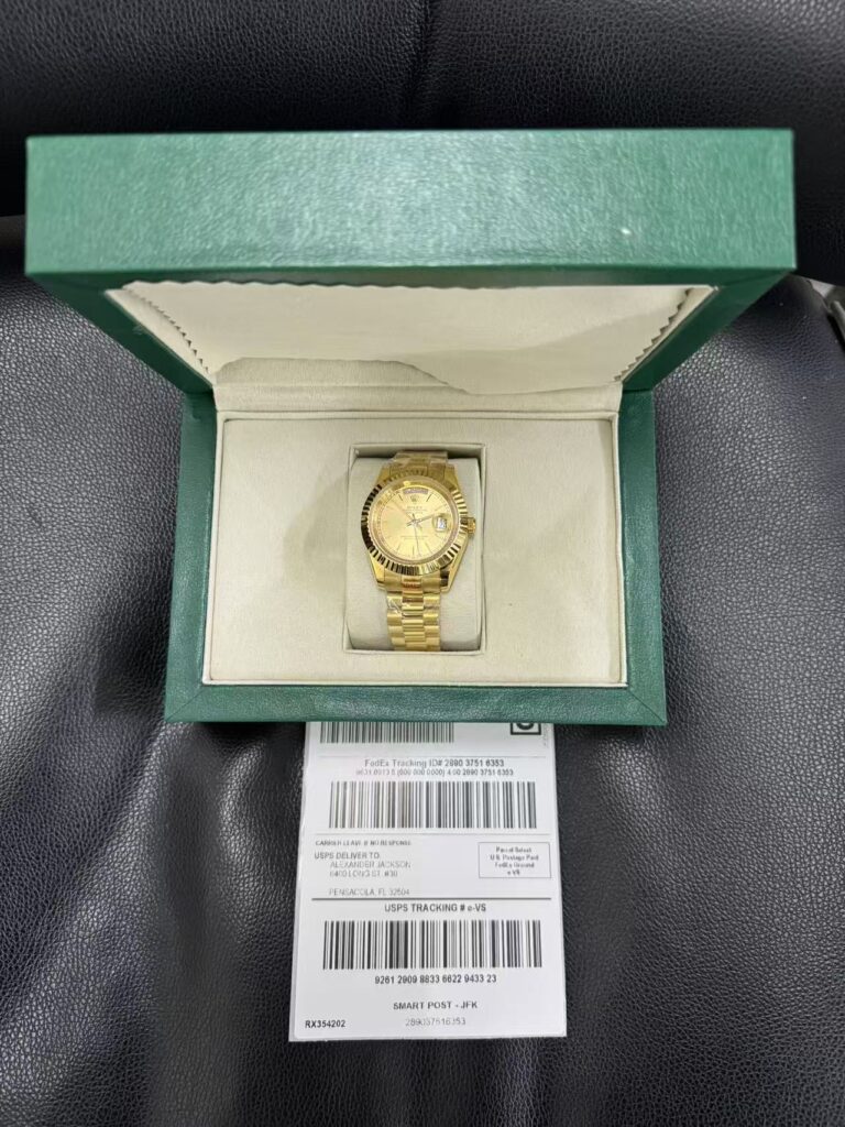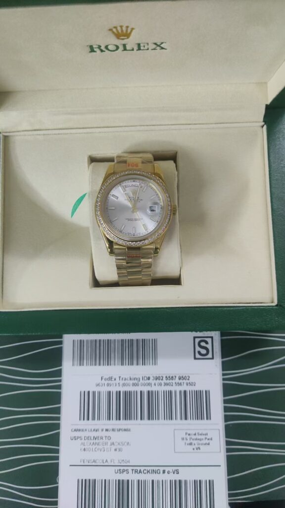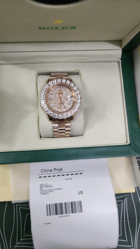 Model: Rolex Day-DateCase Size: 36mmCase Material: Stainless Steel or 18K Gold (varies by customization)Dial: Custom diamond-set dial (various colors/designs possible)Bezel: Custom diamond bezelMovement: Rolex Automatic Self-Winding Movement (typically Caliber 3155 for genuine base)Bracelet: President or Oyster bracelet with diamond-set center links (may vary)Crystal: Scratch-resistant sapphire crystal with Cyclops lensFunctions: Day display at 12 o’clock, Date display at 3 o’clockWater Resistance: 100 meters / 330 feetCondition: Custom / Aftermarket modifiedOrigin: Switzerland (base watch), aftermarket diamonds/customization may vary