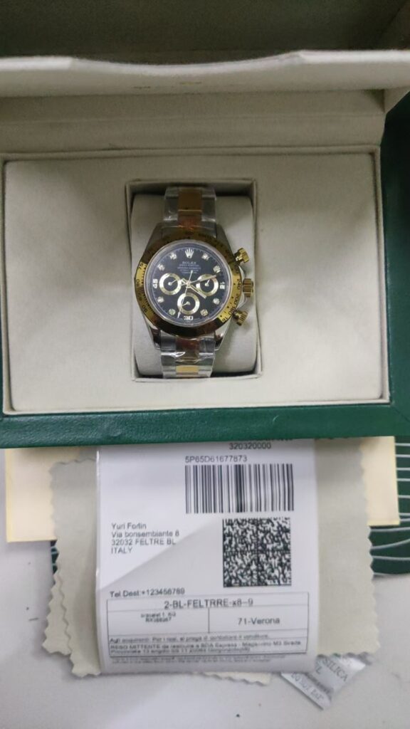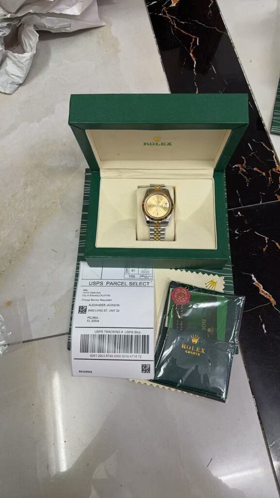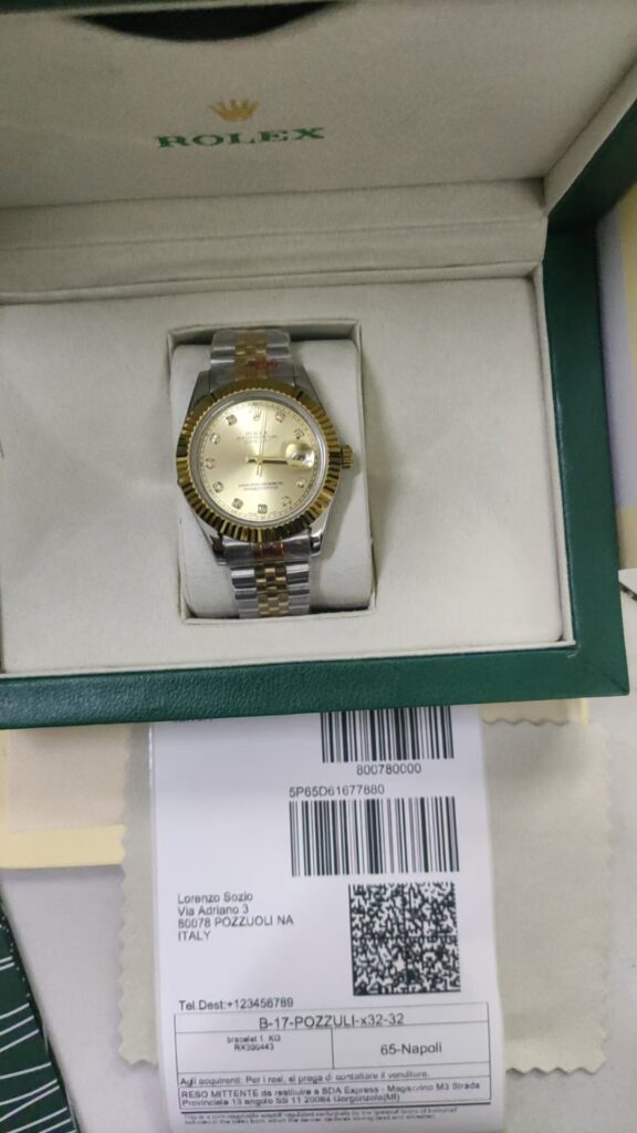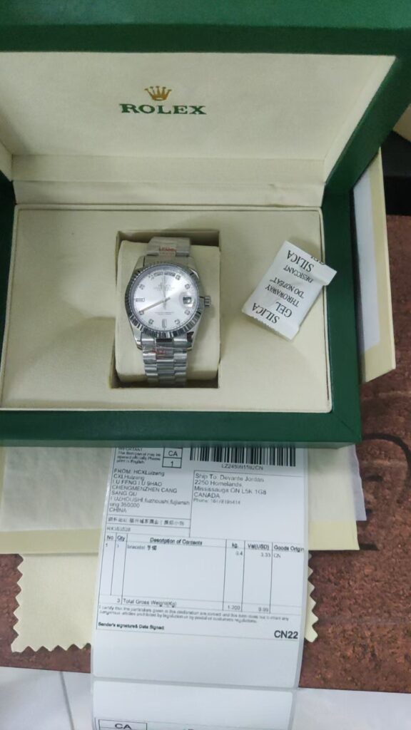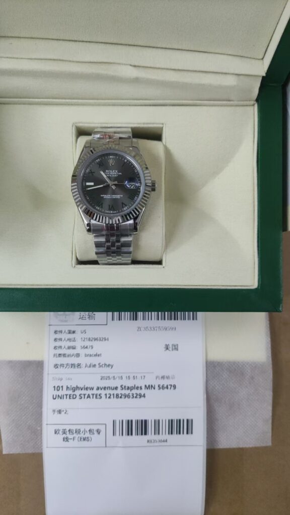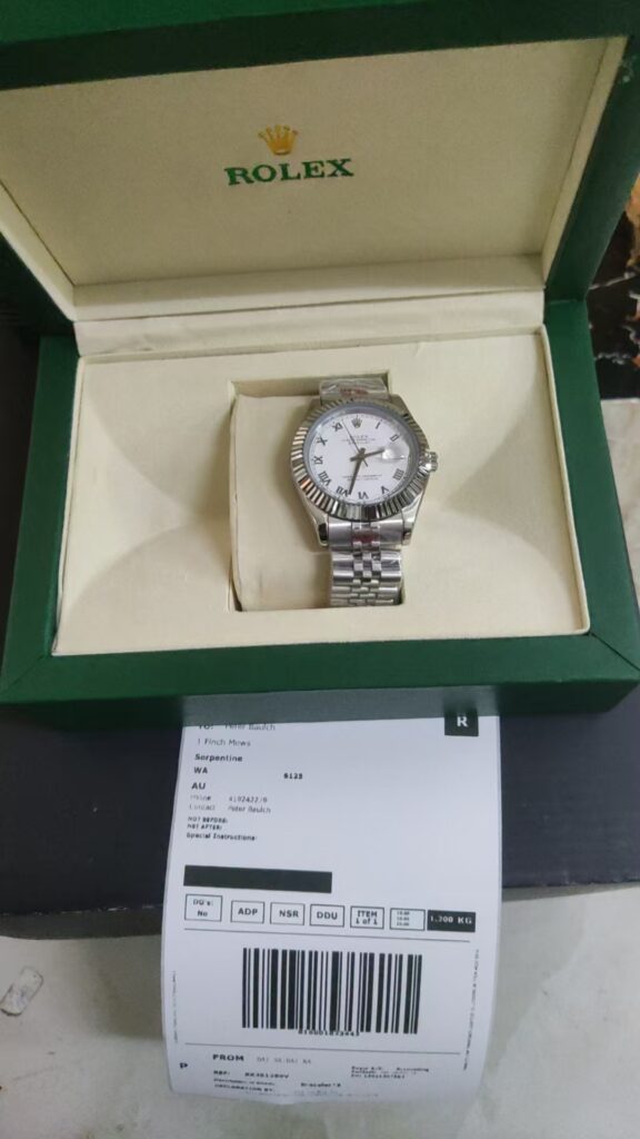 Model: Rolex Day-DateCase Size: 36mmCase Material: Stainless Steel or 18K Gold (varies by customization)Dial: Custom diamond-set dial (various colors/designs possible)Bezel: Custom diamond bezelMovement: Rolex Automatic Self-Winding Movement (typically Caliber 3155 for genuine base)Bracelet: President or Oyster bracelet with diamond-set center links (may vary)Crystal: Scratch-resistant sapphire crystal with Cyclops lensFunctions: Day display at 12 o’clock, Date display at 3 o’clockWater Resistance: 100 meters / 330 feetCondition: Custom / Aftermarket modifiedOrigin: Switzerland (base watch), aftermarket diamonds/customization may vary